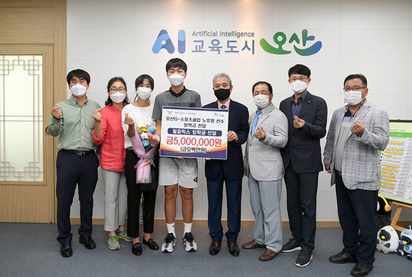 [마이TV=오산] 경기 오산시는 5일 필옵틱스(대표이사 한기수)가 오산 G-스포츠클럽 테니스팀(감독 이진아) 소속 노호영(16)선수에게 500만 원의 장학금을 전달했다고 전했다.
