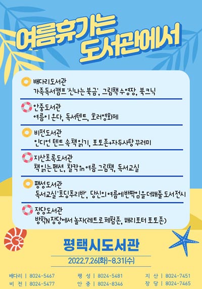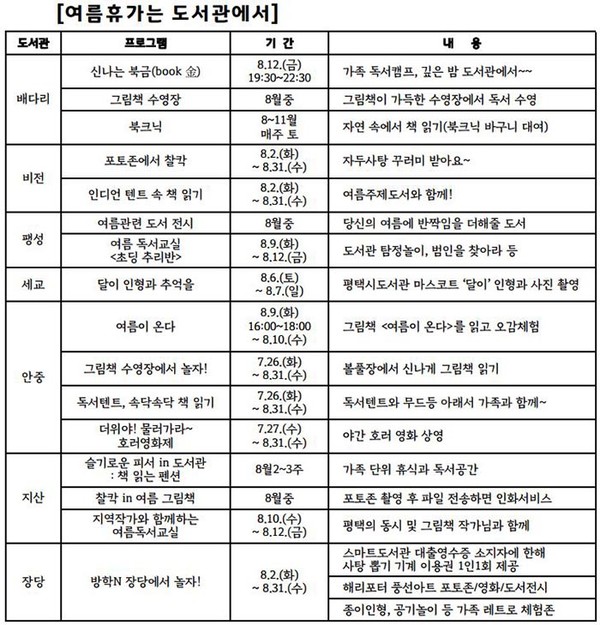 ‘여름휴가는 도서관에서’ 도서관별 상세 프로그램은 평택시도서관 누리집(www.ptlib.go.kr) 및 각 도서관(☎배다리 031-8024-5467, ☎비전 8024-5477, ☎팽성 8024-5481, ☎안중 8024-8346, ☎지산초록 8024-7451, ☎장당 8024-7465)으로 문의하면 된다.