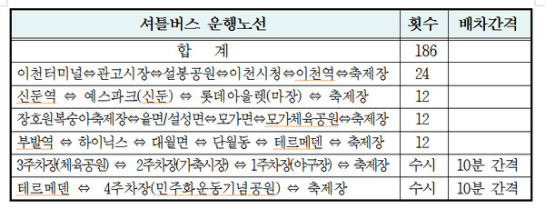 더불어 롯데아웃렛과 이천역, 터미널 등 시내와 주요 거점을 비롯해 장호원 율면까지 셔틀버스를 운영하면서 제21회 이천쌀문화축제 뿐만 아니라 이천 전 지역 관광 테마 버스 역할을 하게 될 것으로 기대된다.