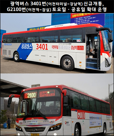 2) 광역버스 3401번(이천터미널~강남역) 신규 개통, G2100번(이천역~잠실) 토요일·공휴일 확대 운영