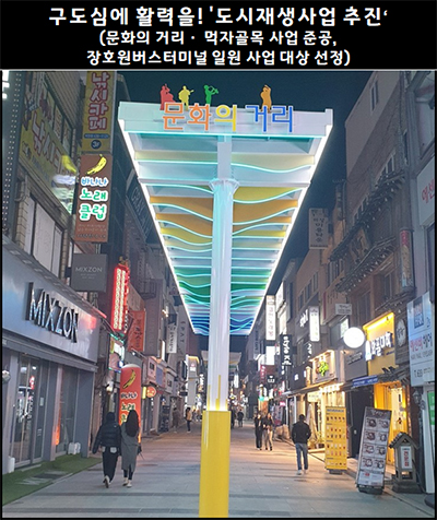 구도심의 활성화를 도모하기 위해 국토교통부와 이천시가 주관하는 도시재생사업으로 ‘창전동 문화의거리’, ‘먹자골목’사업을 준공하였으며, ‘장호원 버스터미널 일원’(84,000㎡ 대상)을 예비사업으로 선정하였다. 특히 문화의 거리 사업을 추진함으로써 구도심과 신도시의 격차를 해소하고 지역경제 활성화에 기여했다.