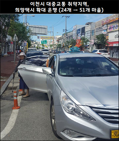 이천시의 대중교통 취약지역에서 이용가능한 희망택시를 기존 6개 읍면동 24개 마을에서 8개 읍면동 51개 마을로 확대 운행함으로써 대중교통의 노선이 부족한 지역에 거주하는 시민들의 이동편의성을 개선했다.