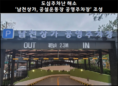 남천상가 공영주차장은 남천공원 부지를 활용해 지하2층 규모의 224면을 조성하였으며, 공설운동장 공영주차장은 건물 2개동, 지상4층 규모의 457면을 조성중이다.