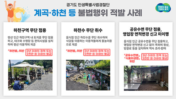 경기도는 지난 2019년부터 도내 계곡, 하천을 중심으로 발생하고 있는 다양한 불법행위를 특사경에서 적극적으로 단속하고, 도 및 시군 하천관리 부서의 합동 관리도 추진하고 있다. 이에 2019년 142건, 2020년 74건, 2021년 47건, 2022년 68건, 2023년 38건 등 불법행위 적발건수는 매년 감소하고 있지만 여전히 일부 휴양지 내에서 휴가철인 7~8월 사이 행정기관의 단속을 피해 불법행위가 기승을 부리고 있다.
