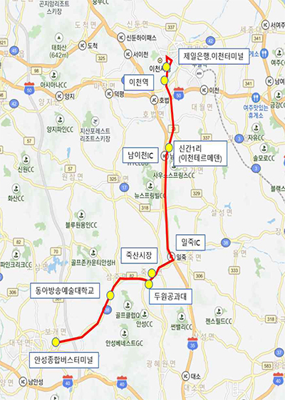 노선 경로는 안성종합버스터미널에서 출발해 동아방송예술대학교, 두원공과대학교 및 죽산시장을 정차하고 일죽IC 및 남이천IC를 경유해 이천테르메덴, 이천역, 이천터미널을 정차하게 된다. 이천역에서 경강선 전철 이용시 판교역은 약 30분, 여주역은 약 15분 안에 이동할 수 있게 된다.