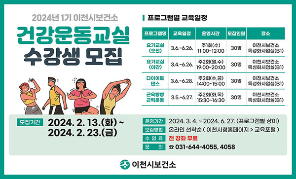 [마이TV=이천] 경기 이천시보건소는 시민들이 건강한 일상!, 더 건강하게!! 건강생활을 실천할 수 있도록 ‘2024년 건강운동교실’을 운영하기 위해 1기 참여자를 선착순으로 모집한다.