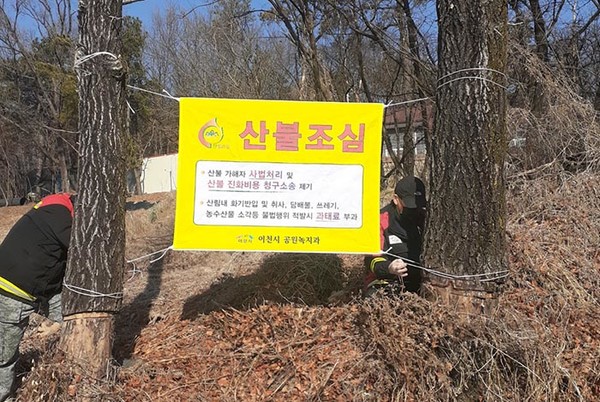 같은 기간 산불전문예방진화대원 13명은 이천시 전지역을 대상으로 산불예방 홍보를 위해 ‘산불조심, 소각금지’ 현수막 설치, 영농부산물과 쓰레기 소각금지 리플렛 배부, 동지역 영농부산물 파쇄작업을 시행할 계획이다.