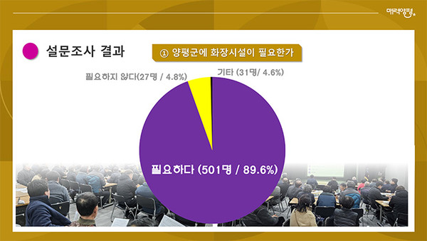 이번 설명회에서 실시한 설문조사 결과(응답자 559명) 양평군민이 희망하는 장사 방법으로는 ‘화장’이 96.2%(538명)로 가장 높게 나타났으며, 양평군에 화장사시설이 필요한가에 대한 질문에는 ‘필요하다’가 89.6%(501명)로 가장 높게 나타났다.
