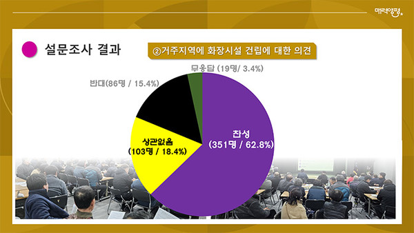 또한, 거주지역(주변마을 및 해당 읍면포함)의 종합장사시설 건립에 동의하는가에 대한 질문에는 찬성 62.8%(351명), 상관없음 18.4%(103명), 반대 15.4%(86명), 무응답 3.4%(19명) 순으로 나타나, 종합장사시설 건립에 대한 주민의식이 긍정적임을 확인했다.
