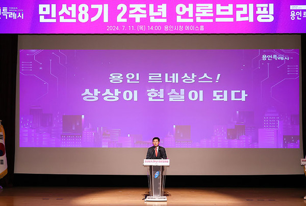이상일 용인특례시장은 11일 용인특례시청 에이스홀에서 민선 8기 취임 2주년 언론 브리핑을 통해 “세계 최대 반도체 메가 클러스터 조성이란 새로운 환경에 맞춰 도시구조와 기능을 재설정하고, 대한민국 반도체 중심도시 기능을 원활하게 수행할 대도시를 만들어 나갈 생각”이라고 밝혔다.