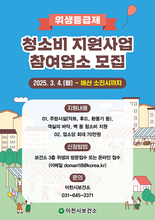 [마이TV=이천] 경기 이천시는 쾌적한 외식문화를 구축하기 위한 노력으로 음식점 위생 등급 지정업소를 대상으로 청소비 지원사업을 추진한다고 21일 밝혔다.