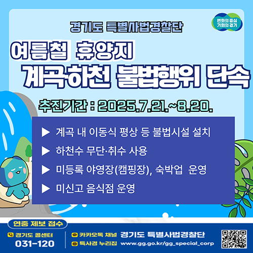[마이TV=경기] 여름 휴가철을 맞아 경기도가 7월 21일부터 8월 20일까지 도내 주요 계곡과 하천 등 휴양지에서 발생하는 불법행위를 집중 단속한다.