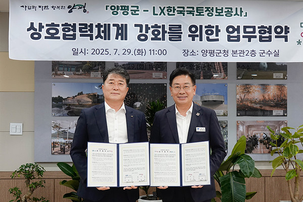 [마이TV=양평] 경기 양평군과 LX한국국토정보공사(사장 어명소)는 지난 29일 군청에서 ‘공유재산 관리·활용 및 상호협력체계 강화를 위한 업무협약’을 체결했다.