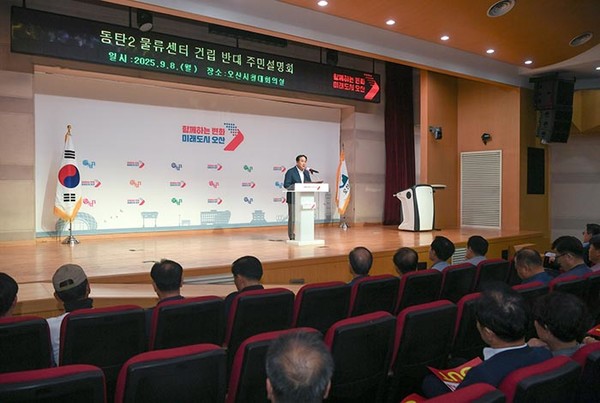 [마이TV=오산] 이권재 오산시장은 8일 오후 화성시 장지동 1131번지 일원에서 추진 중인 동탄2 초대형 물류센터 건립 사태와 관련한 주민설명회에서 건립계획을 강하게 규탄하고, 사업 전면 철회를 재차 촉구했다.