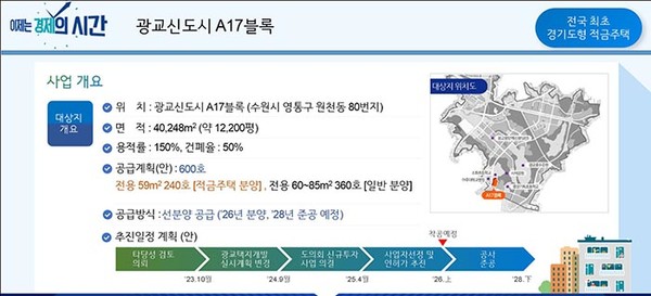 광교A17 블록 전용면적 60㎡이하 240호. 경기도형 적금주택으로 건설해 분양 예정