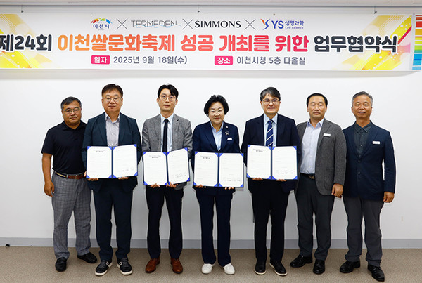 [마이TV=이천] 경기 이천쌀문화축제추진위원회(위원장 김경희)는 18일 테르메덴, 시몬스, YS생명과학과 업무협약을 체결했다.