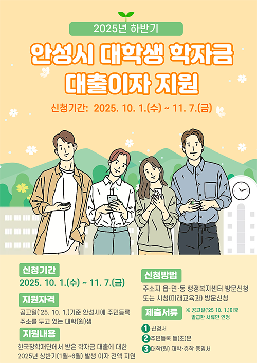 [마이TV=안성] 경기 안성시는 오는 10월 1일부터 11월 7일까지 ‘2025년도 하반기 안성시 대학생 학자금 대출이자’ 지원 신청을 받는다.