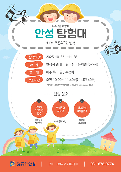 [마이TV=안성] 경기 안성시는 상반기에 시범 운영해 큰 호응을 얻은 유아 대상 체험형 프로그램 ‘안성 탐험대: 역사 속으로, 음악 속으로!’를 하반기에도 운영하며, 지역 문화시설 활성화에 나선다.