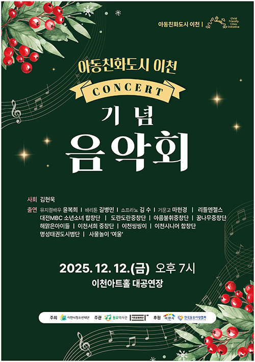 [마이TV=이천] 경기 이천시의 아동친화도시 지정을 기념하는 ‘아동친화도시 이천 기념 음악회’가 12월 12일 오후 7시, 이천아트홀 대공연장에서 성대하게 개최한다.