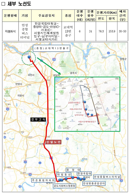 신설 광역버스는 안성종합버스터미널을 기점으로 안성맞춤공감센터, 한경국립대학교, 중앙대·롯데캐슬아파트, 대림동산, 공도시외버스정류장, 주은·풍림아파트를 거쳐 서울시인재개발원 입구, 남부터미널, 서울교대사거리, 교대역을 운행하는 노선으로, 차량 6대로 일 24회 운행하며 배차간격은 30~50분이다.