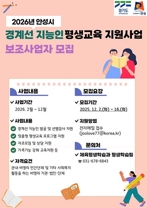 [마이TV=안성] 경기 안성시는 관내 경계선 지능인의 진단·학습·가족 지원을 체계화하고 포용적 학습환경을 조성하기 위해 2일부터 16일까지 「2026년 경계선 지능인 평생교육 지원사업」을 수행할 보조사업자를 공모한다.