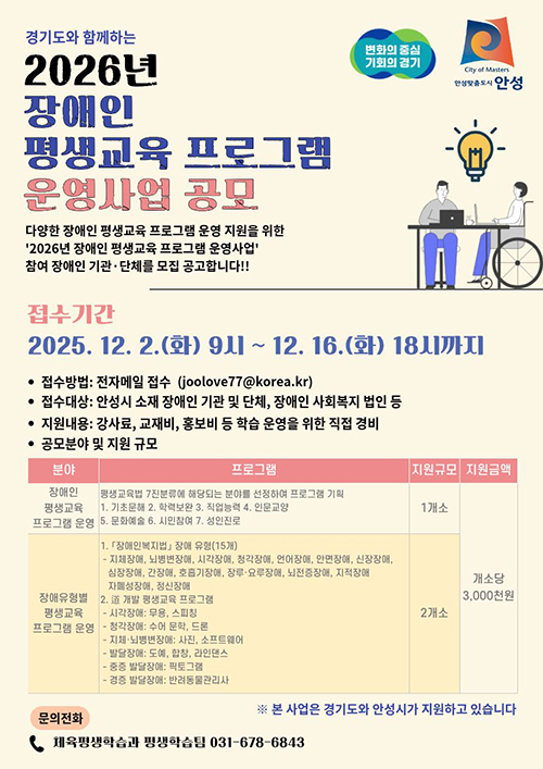 신청 대상은 안성시에 주소(등록)를 둔 장애인 평생교육 기관‧단체이며, 신청 기간은 12월 2일부터 16일까지이다.