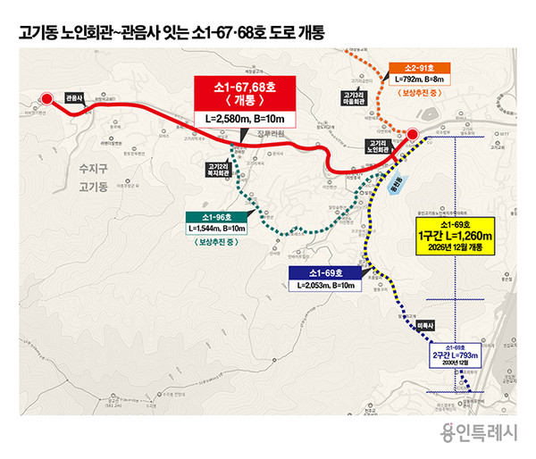 [마이TV-용인] 경기 용인특례시는 지난 11월 30일 수지구 고기동 노인회관에서 관음사까지 이어지는 도시계획도로 소1-67·68호선(연장 2.58km)을 개통했다고 1일 밝혔다.